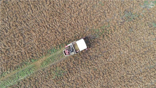 △2021年11月3日,在位于山東省東營(yíng)市的黃河三角洲農(nóng)業(yè)高新技術(shù)產(chǎn)業(yè)示范區(qū),工人正操控機(jī)械開(kāi)鐮收割東航D11號(hào)航天大豆。