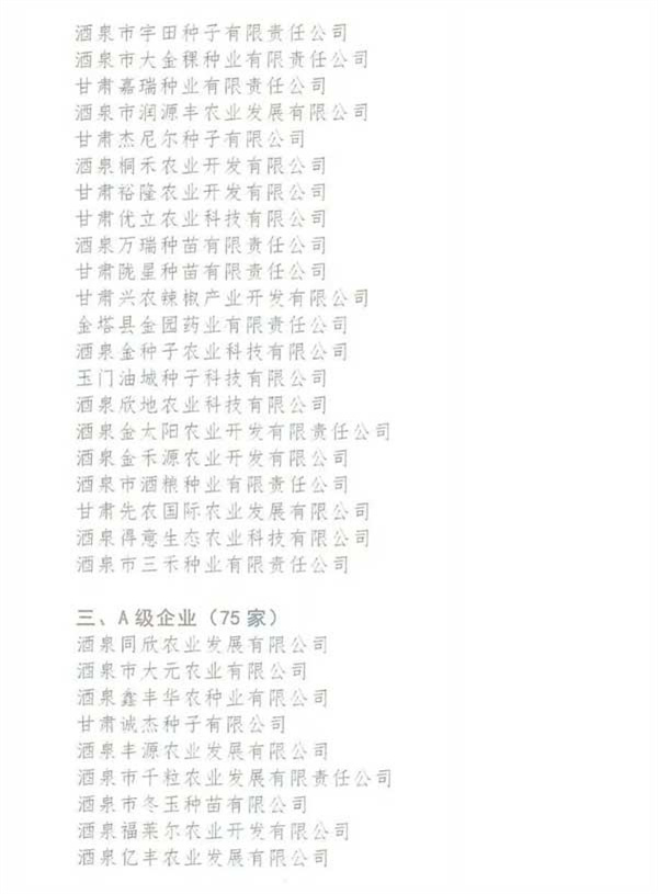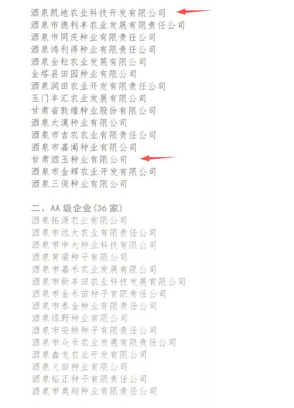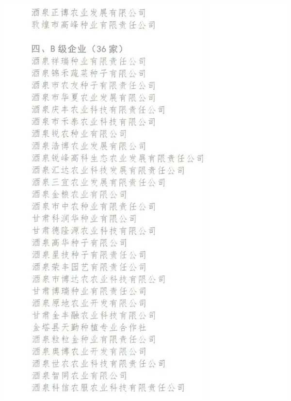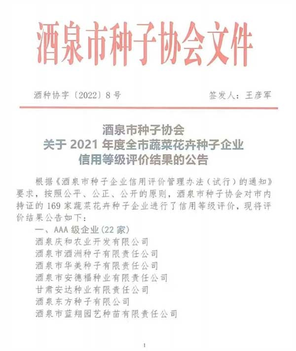 為推動全市蔬菜花卉種子產業(yè)健康快速穩(wěn)定發(fā)展,規(guī)范行業(yè)秩序,強化行業(yè)自律,營造誠實守信、公平競爭的市場環(huán)境。酒泉市種子協(xié)會根據《酒泉市種子企業(yè)信用評價管理辦法(試行)的通知》要求,按照公平、公正、公開、有利于企業(yè)發(fā)展的原則,從企業(yè)綜合素質、管理水平、競爭力、信用記錄、財務能力等五個方面23項指標,對全市蔬菜花卉種子企業(yè)進行了信用等級評價,現將評價結果予以公示。