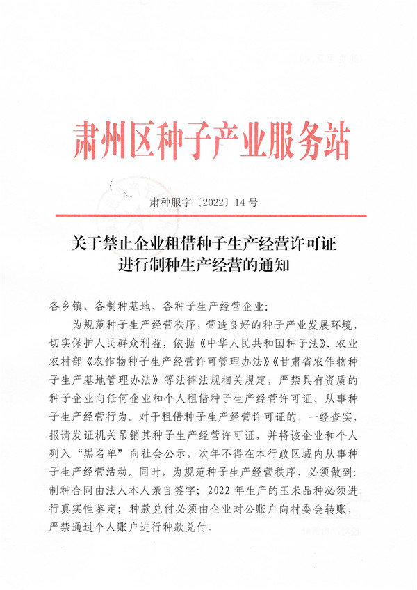 關(guān)于禁止企業(yè)租借種子生產(chǎn)經(jīng)營許可證進(jìn)行制種生產(chǎn)經(jīng)營的通知